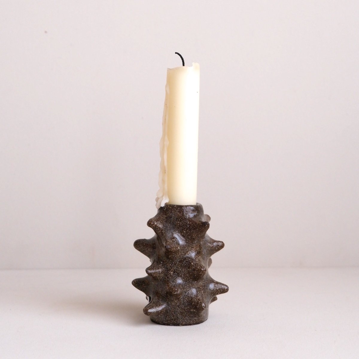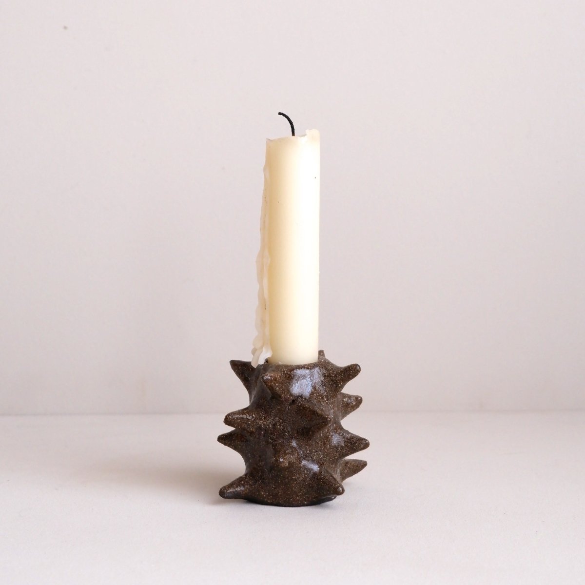 Handmade spiky candleholder in a dark brown clay, finished with a clear glaze and fired up to 1240°c.